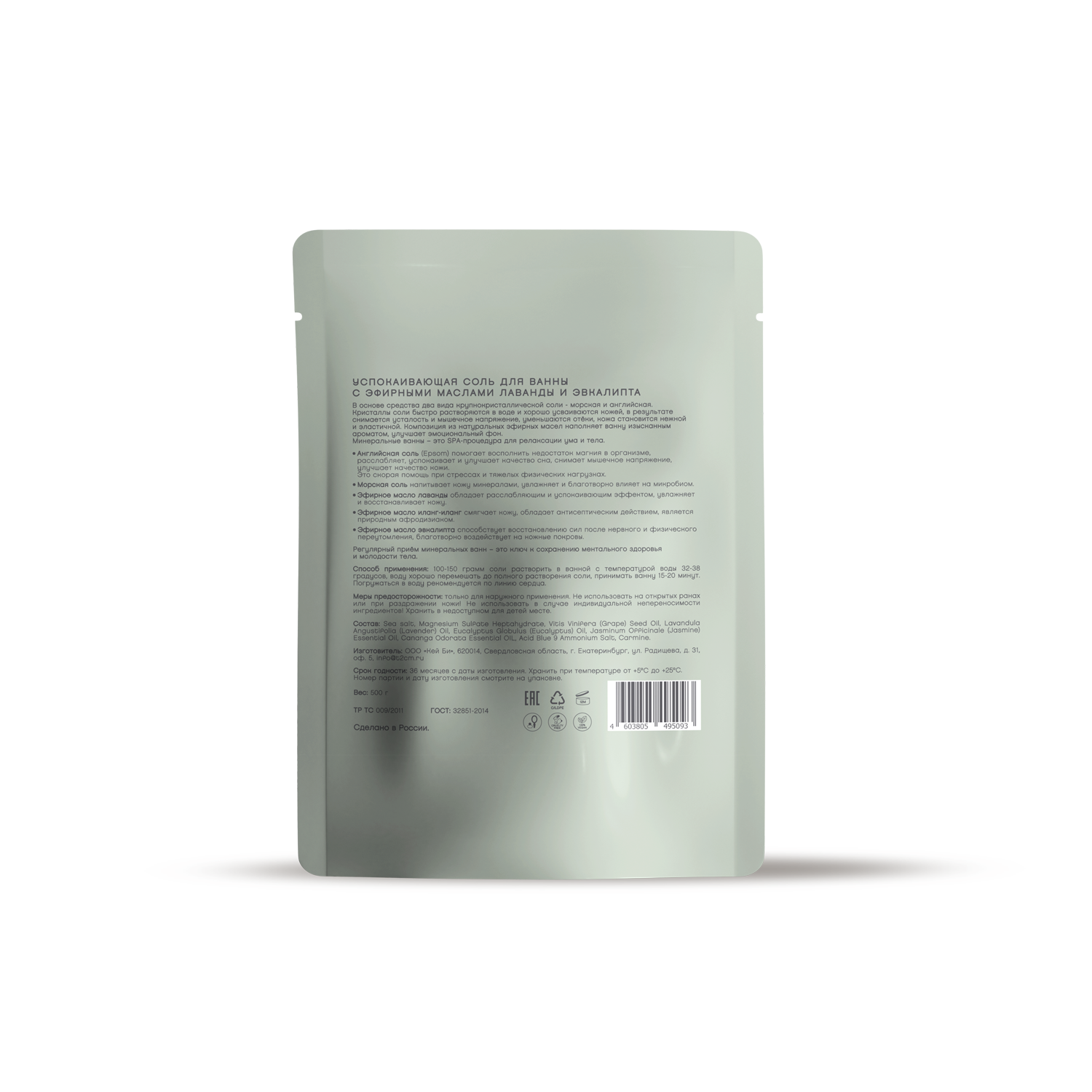 Sea Salt, Magnesium Sulfate Heptahydrate, Vitis Vinifera (Grape) Seed Oil, Lavandula Angustifolia (Lavender) Oil, Eucalyptus Globulus (Eucalyptus) Oil, Jasminum Officinale (Jasmine) Essential Oil, Cananga Odorata Essential Oil, Acid Blue 9 Ammonium Salt, Carmine.